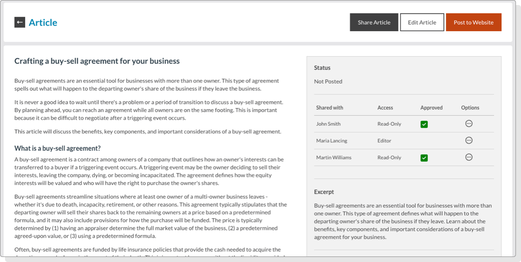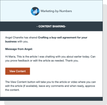 Simply click “share” and enter the name, email address, and instructions. Provide permissions to edit or view only. Articles can be shared with multiple people for group approval. And, no username or password is required to access, edit or approve an article.