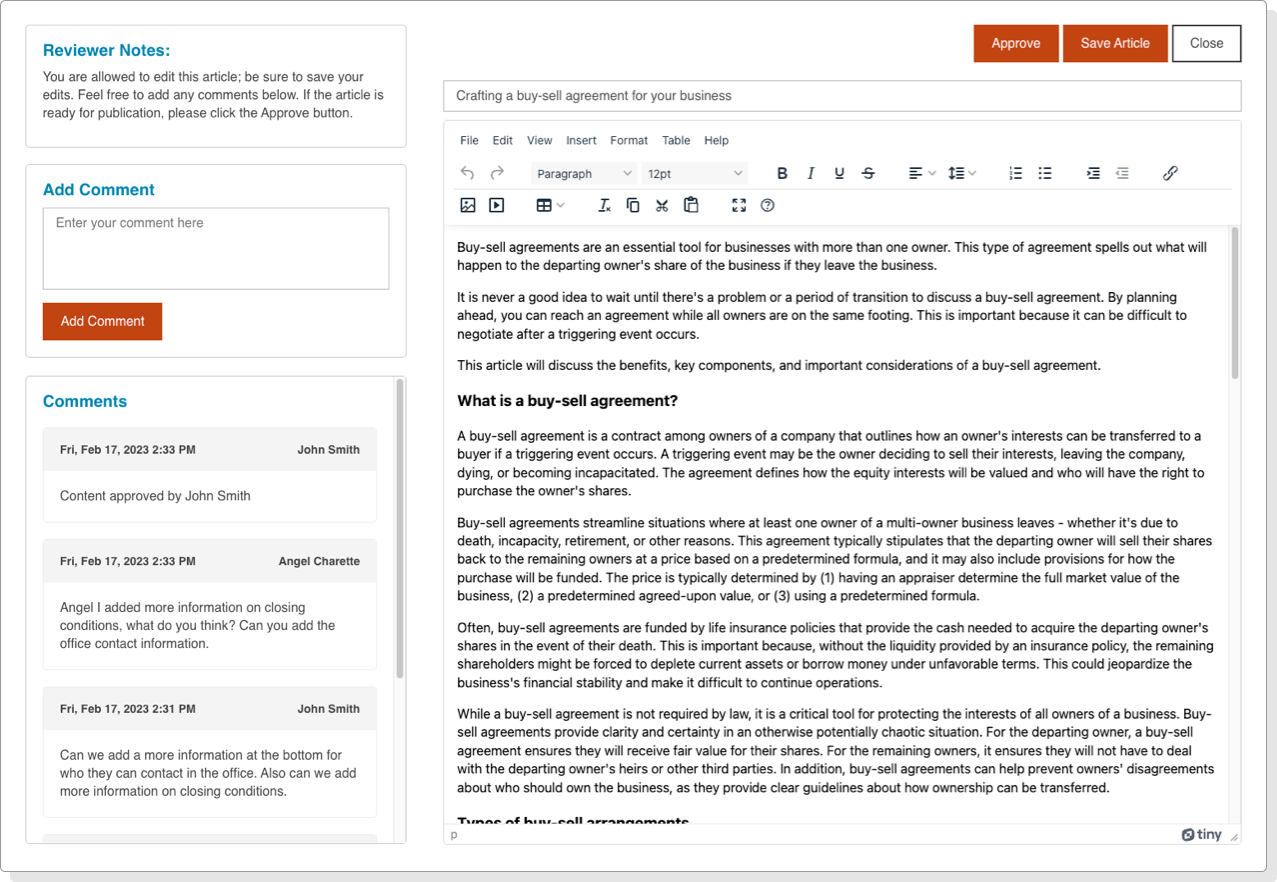 Track who has reviewed and approved each article.