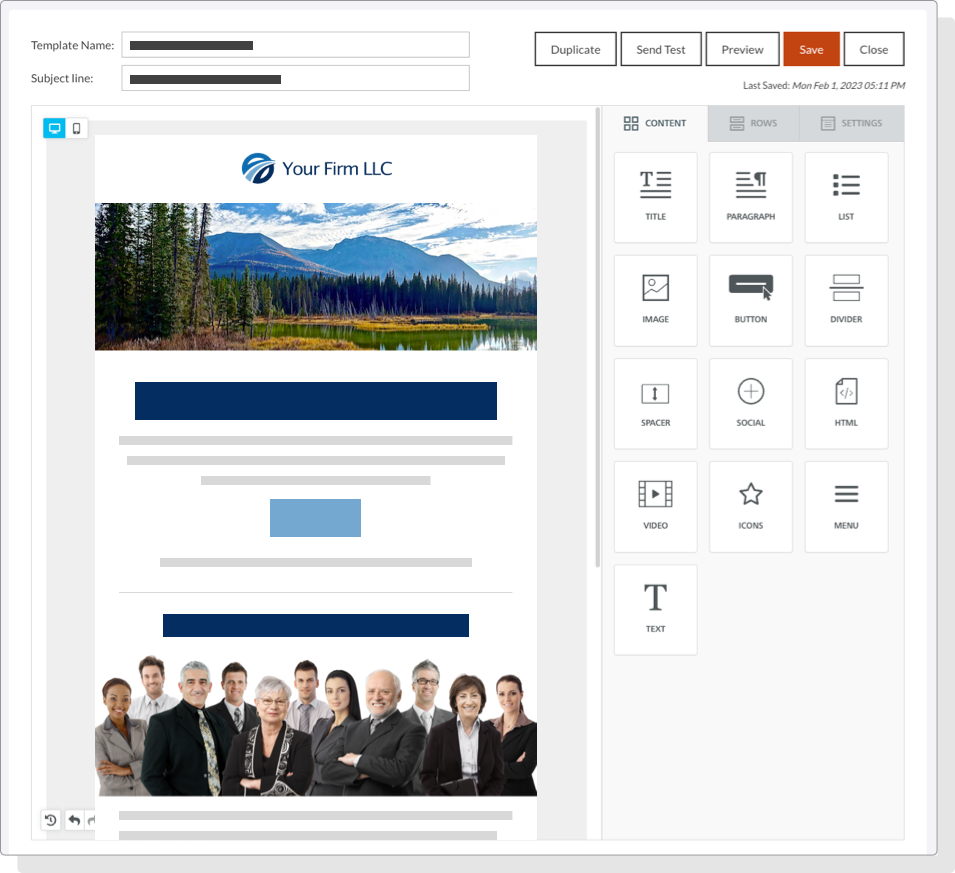 Our drag-and-drop email builder makes it easy to create and customize email templates; add additional topics or a firm update.