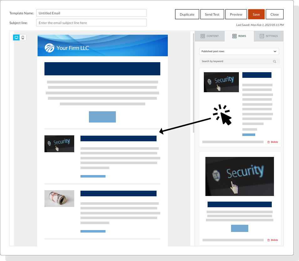 For every topic posted to your resources gallery, we’ll create an email template ready to be sent to your clients and prospects. Send the email as is or make changes using our integrated drag-and-drop email builder.